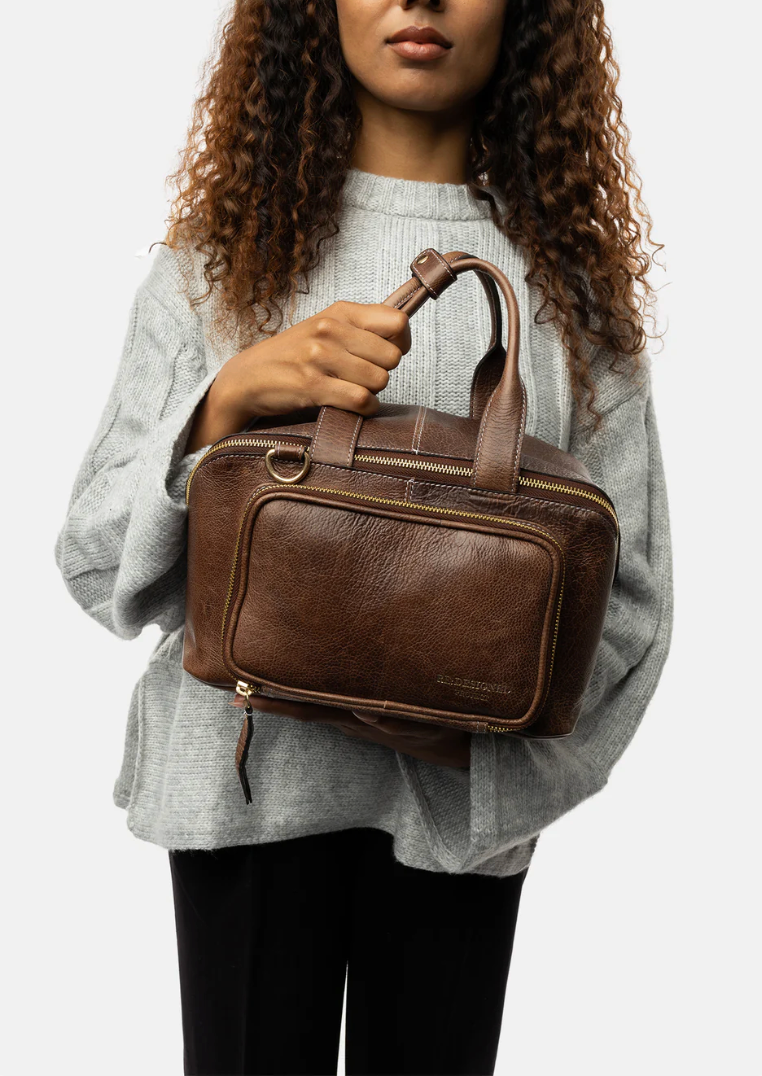 Laget i vår Urban skinnkvalitet – et bearbeidet kuskinn der hver veske farges før overflaten ferdigstilles, slik at skinnets naturlige struktur bevares. Etter farging påføres et lett vokslag, som gir en jevn og myk finish med unike detaljer.