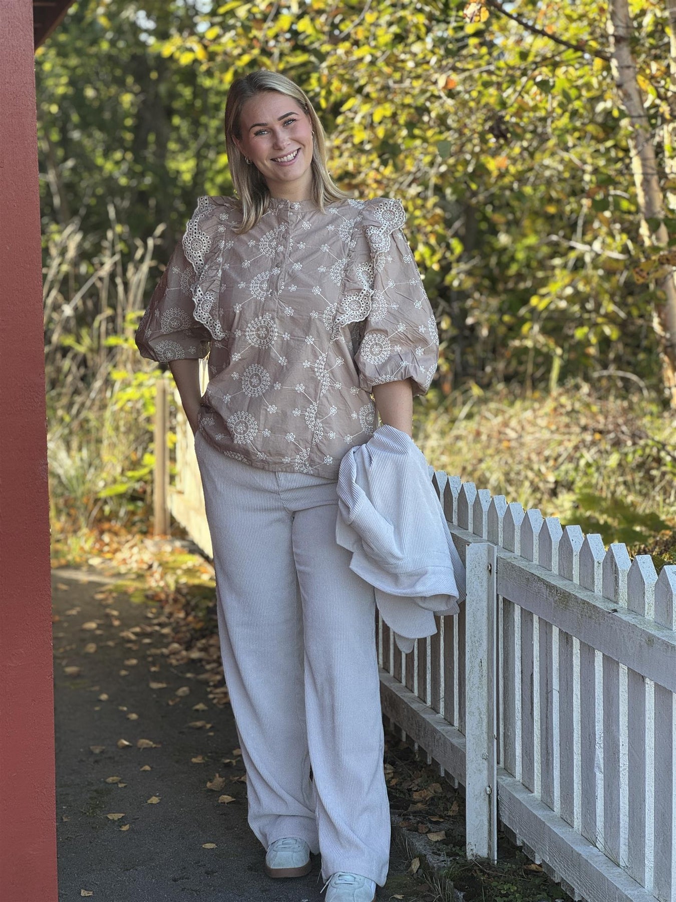 Super fin bluse fra Culture. Blusen har fine volanger, har lange ermer og strikk i armslutt så du kan dra den opp om ønskelig. Blusen har knepper ved bysten så du kan få v-hals om du vil det.