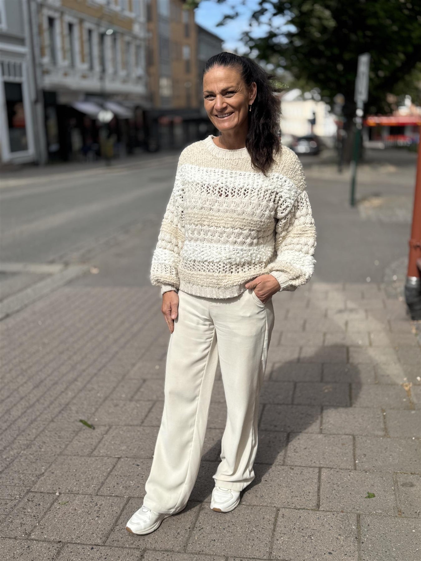 Nydelig stripete genser fra black color. Genseren er i en nydelig off-white farge. Perfekte strikkegenseren nå på høsten og frem mot vinteren. Fin å style til både jeans, over en kjole og skjørt!
