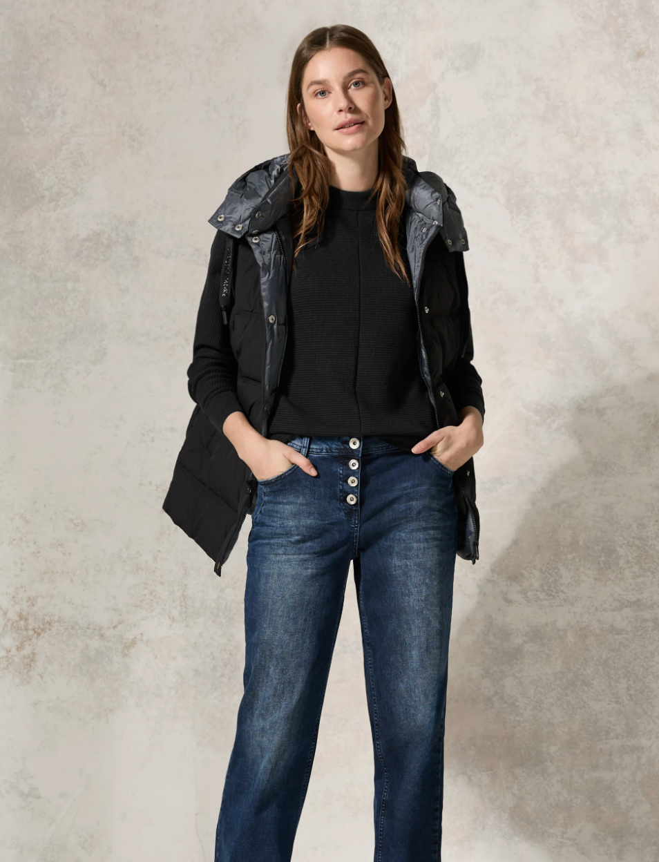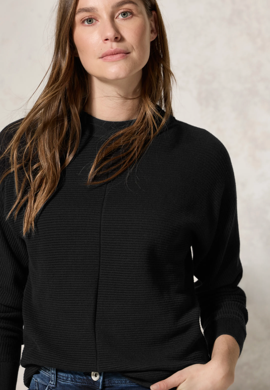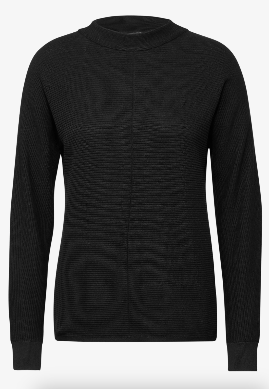 Stilren svart bomullsgenser med ribbestrikket mønster og høy hals. Perfekt for både jobb og fritid. Laget i myk bomull for komfort hele dagen.