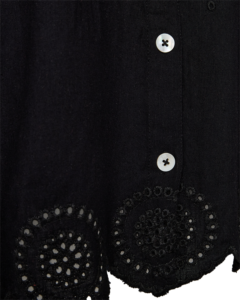 De fine broderie anglaise-detaljene og bølgekanten nederst gir plagget det lille ekstra – samtidig som de hvite knappene i front skaper en lekker kontrast. Skjorten har lange ermer og en avslappet passform som sitter pent på de fleste kropper. Den passer like godt til jeans som til skjørt eller dressbukser.