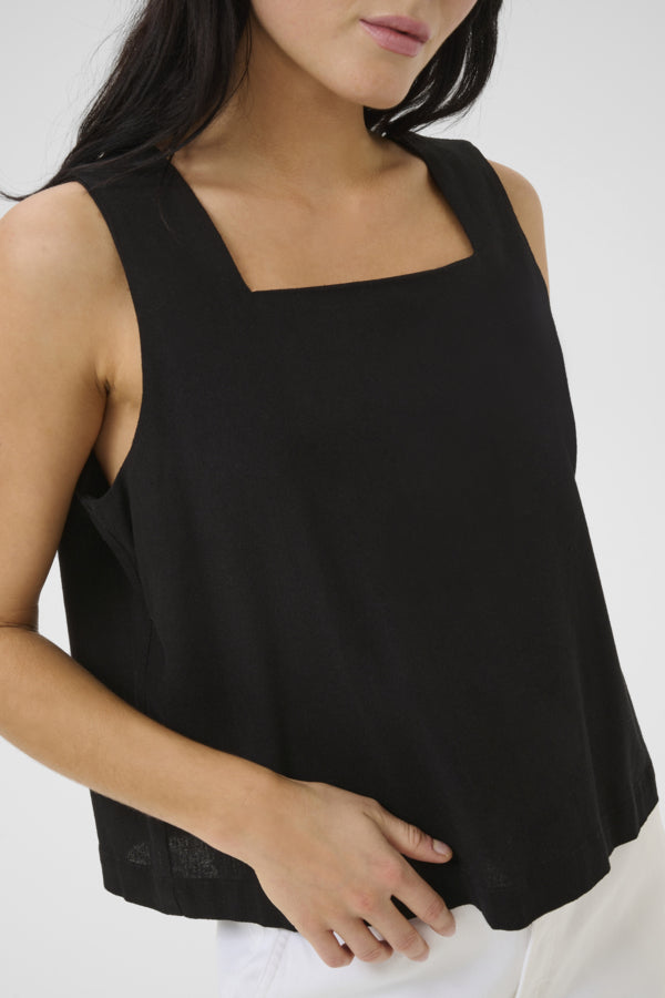 Toppen har en flatterende firkantet hals, brede skulderstropper og en avslappet passform som faller pent over kroppen. Laget i en deilig og pustende blanding av lin og viskose – perfekt for varme sommerdager!