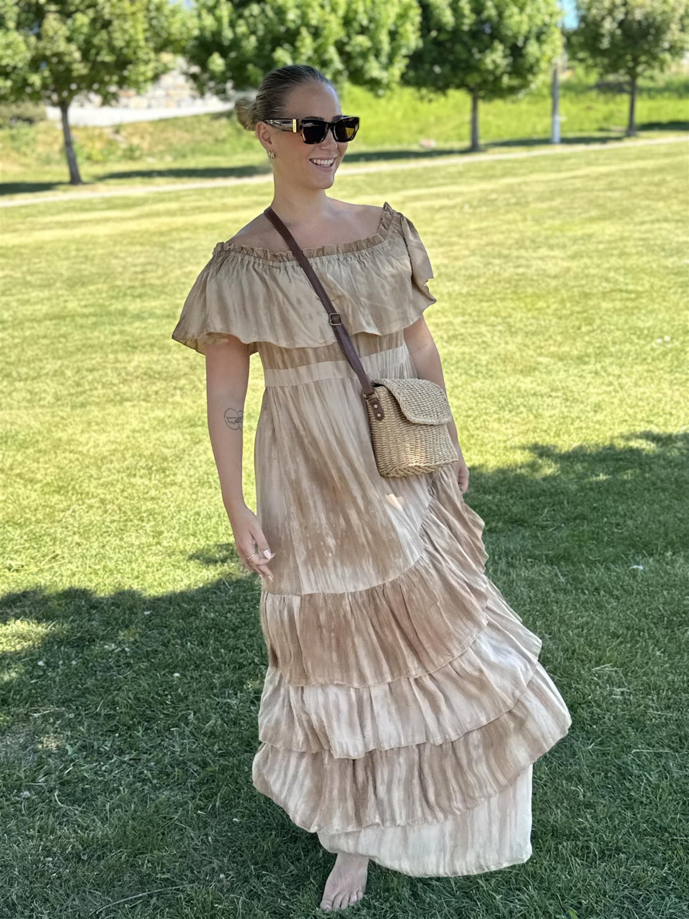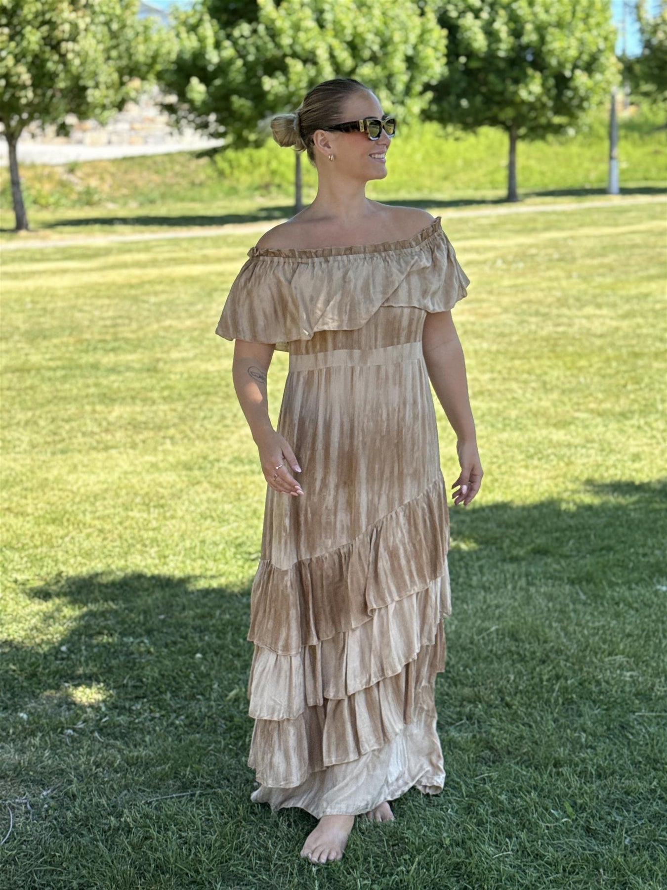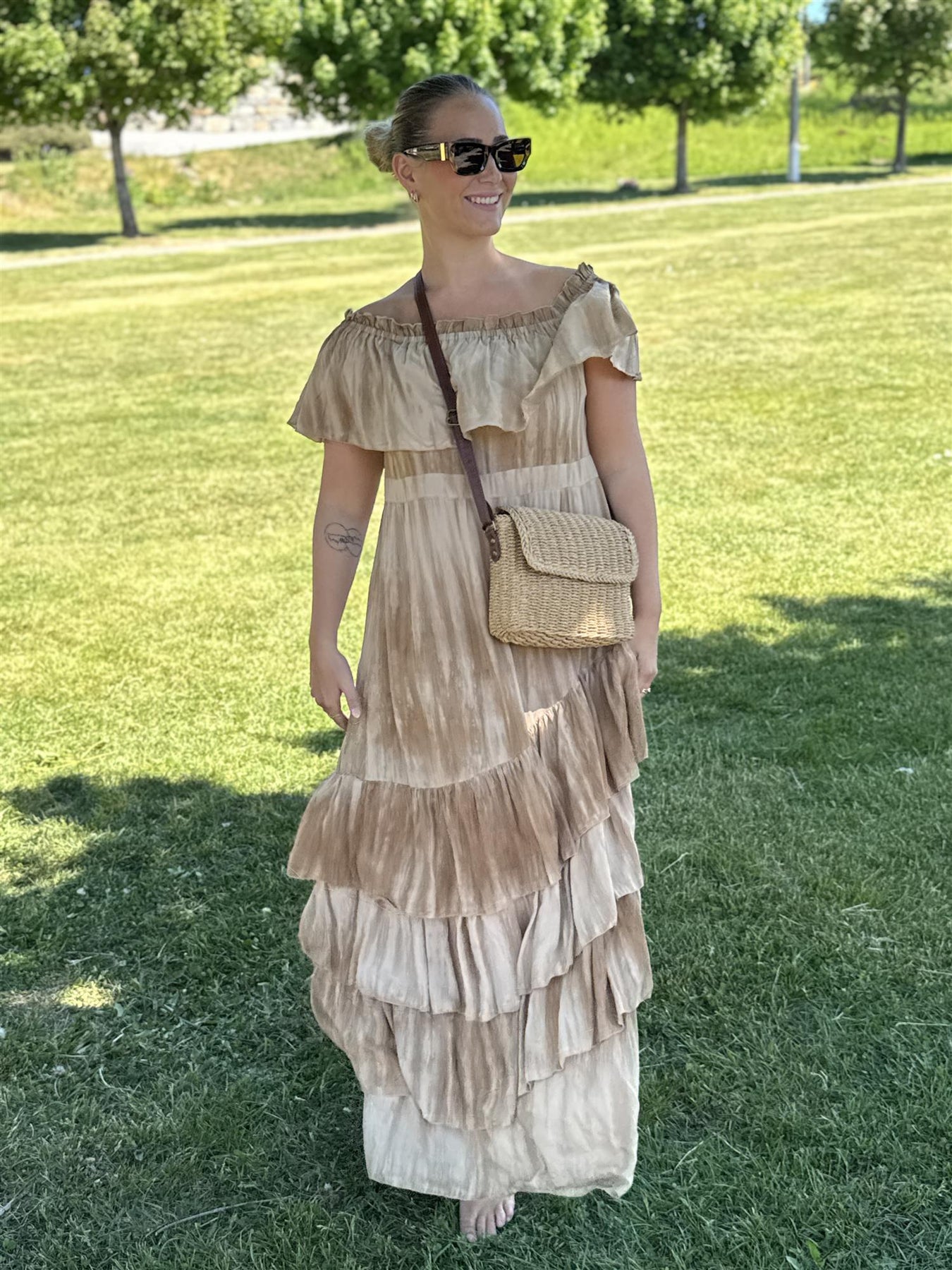 La sommerfølelsen vare hele sesongen med denne luftige og romantiske off-shoulder kjolen i nydelige beige og karamelltoner! En ekte bohemsk favoritt som svinger så fint i vinden, perfekt for alt fra cafétur med venninner til strandferie og sommerfest.
