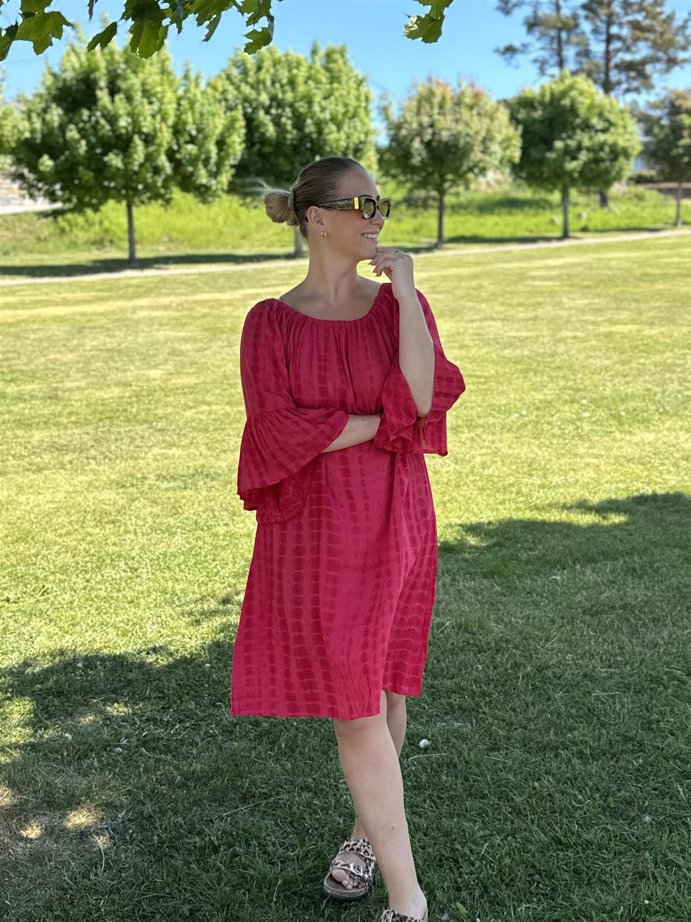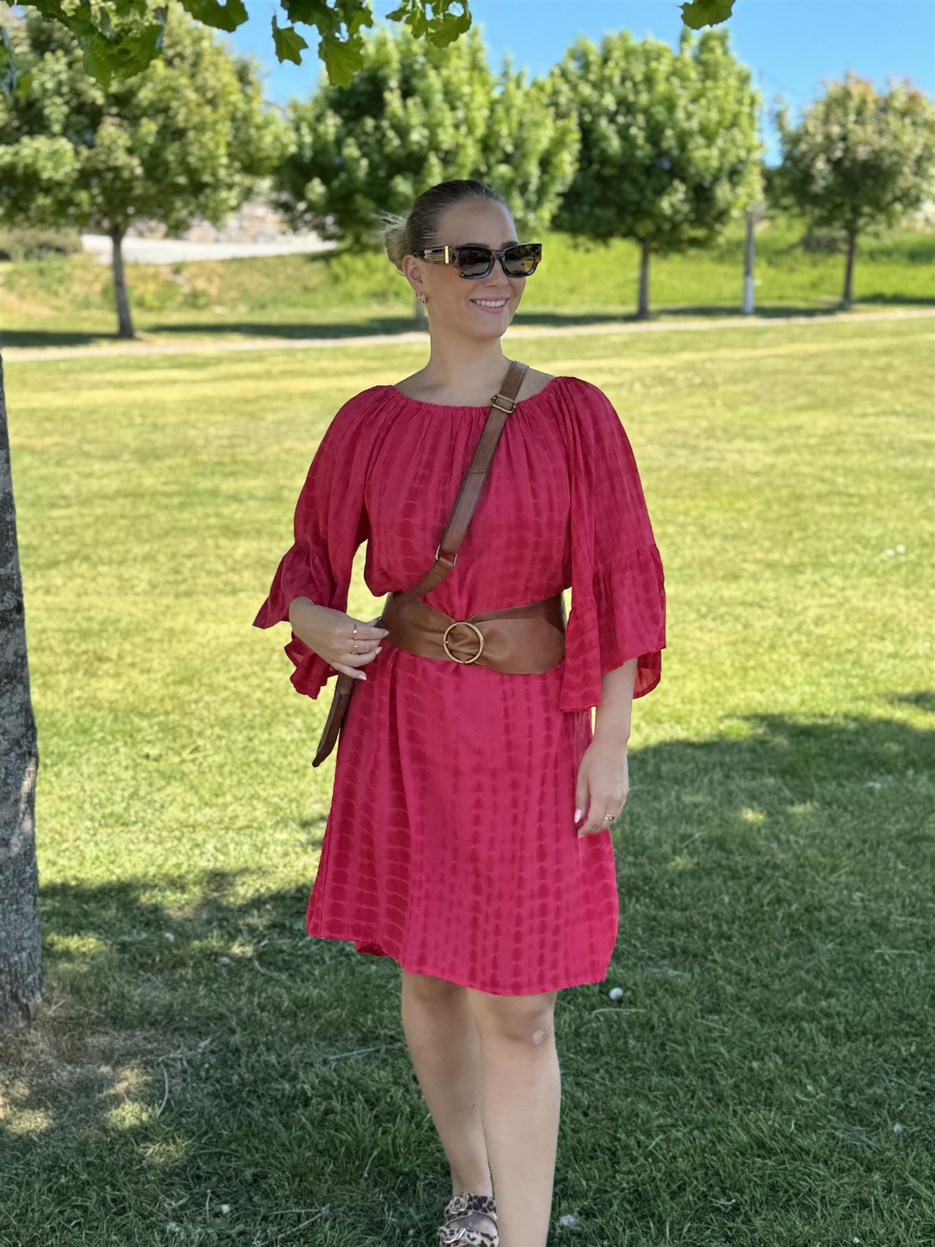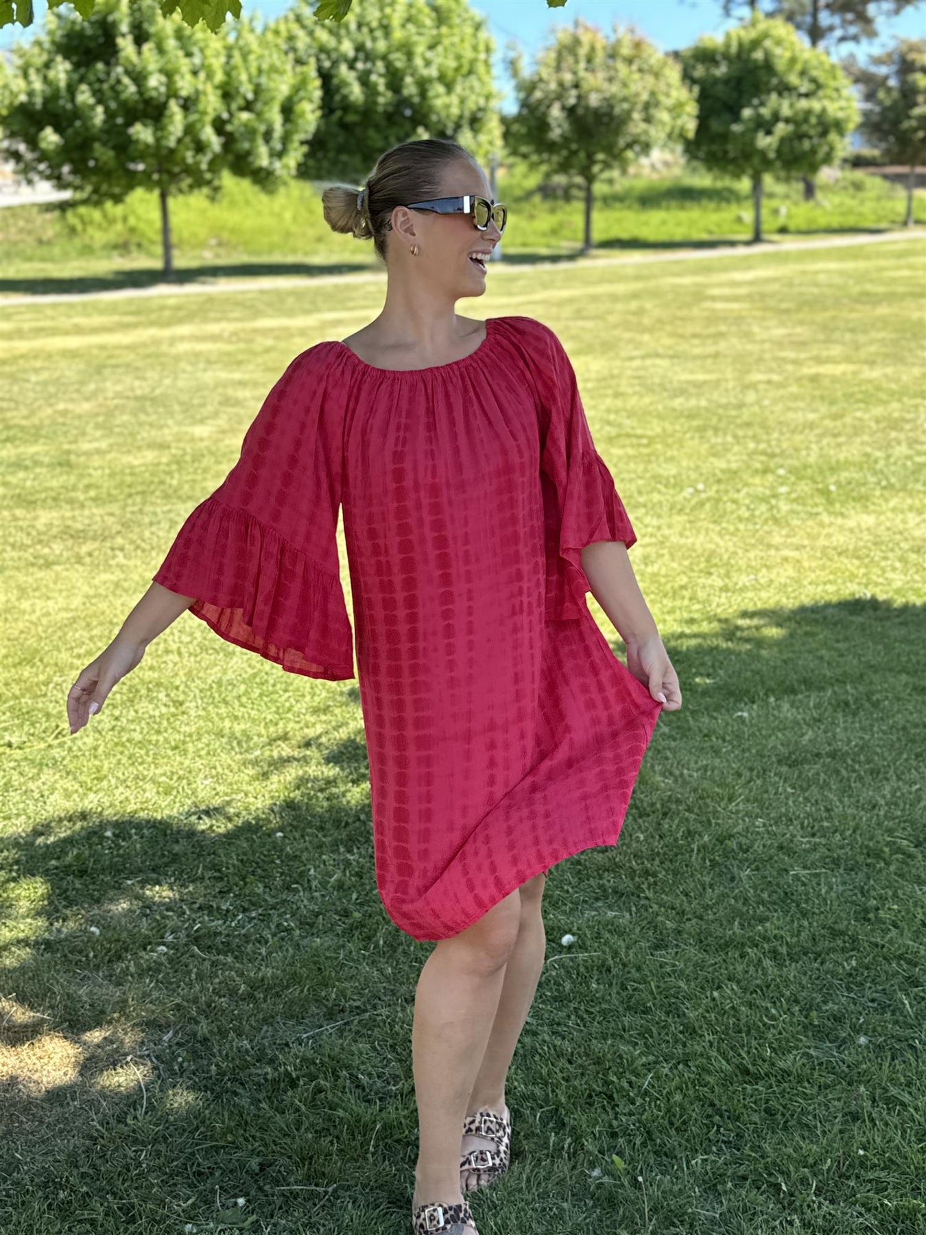 Kjolen har en løs passform som svinger så fint rundt kroppen. Med strikk i halsen kan du bruke den både rundt skuldrene eller opp på skuldrene, alt etter humør og anledning. Ermene har en feminin klokkeform som gir litt ekstra wow-faktor til looken.