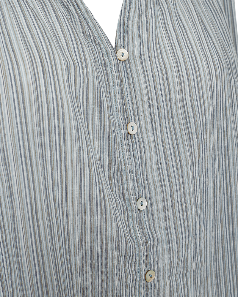 Den har en enkel og flatterende silhuett med V-hals, smockdetaljer i kragen og delikate perlemorsknapper langs fronten. De lange ermene avsluttes med fine volanger, som gir blusen et lett romantisk preg – uten å bli for pyntet.