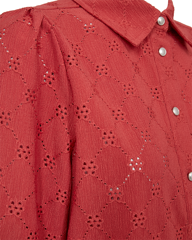 FQleni fra Freequent er en nydelig bluse i lett og stretchy materiale med dekorativt blomsterutskåret mønster som gir et delikat og sofistikert uttrykk. Med 3/4 ermer, klassisk skjortekrage og perleknapper foran, er denne blusen både komfortabel og elegant – perfekt til både hverdag og kontor.