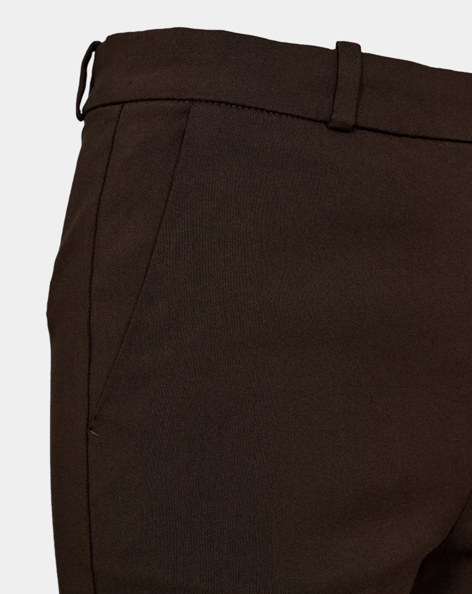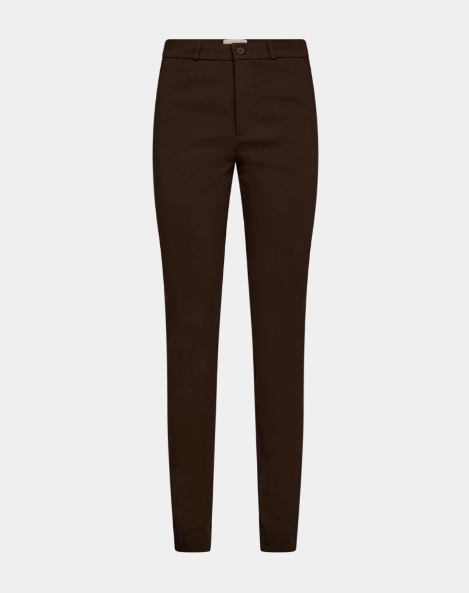 Bukser fra Freequent i en deilig kvalitet. Buksen er enkel i designet med sidelommer, knapp og glidelåslukking foran og en tettsittende passform. Beltestropper og splitt nede i siden ved ankelen