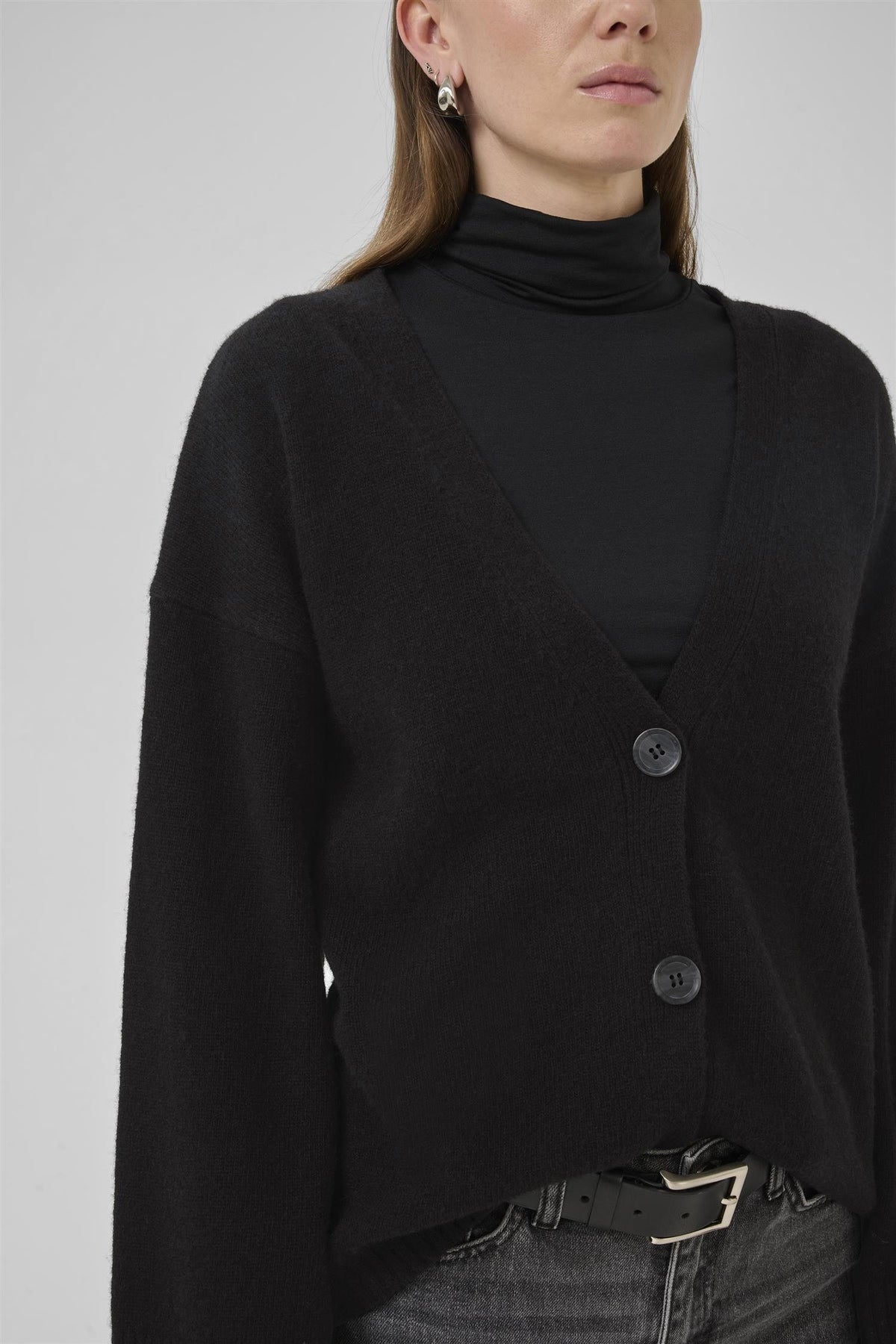 Cardiganen har et klassisk, lett oversized snitt med vide ermer, dype V-hals og store, stilrene knapper. Perfekt å slenge over en t-skjorte eller høyhalset genser, enten du skal på jobb, café eller en tur i byen.