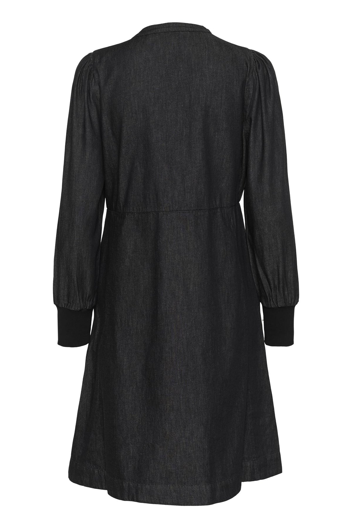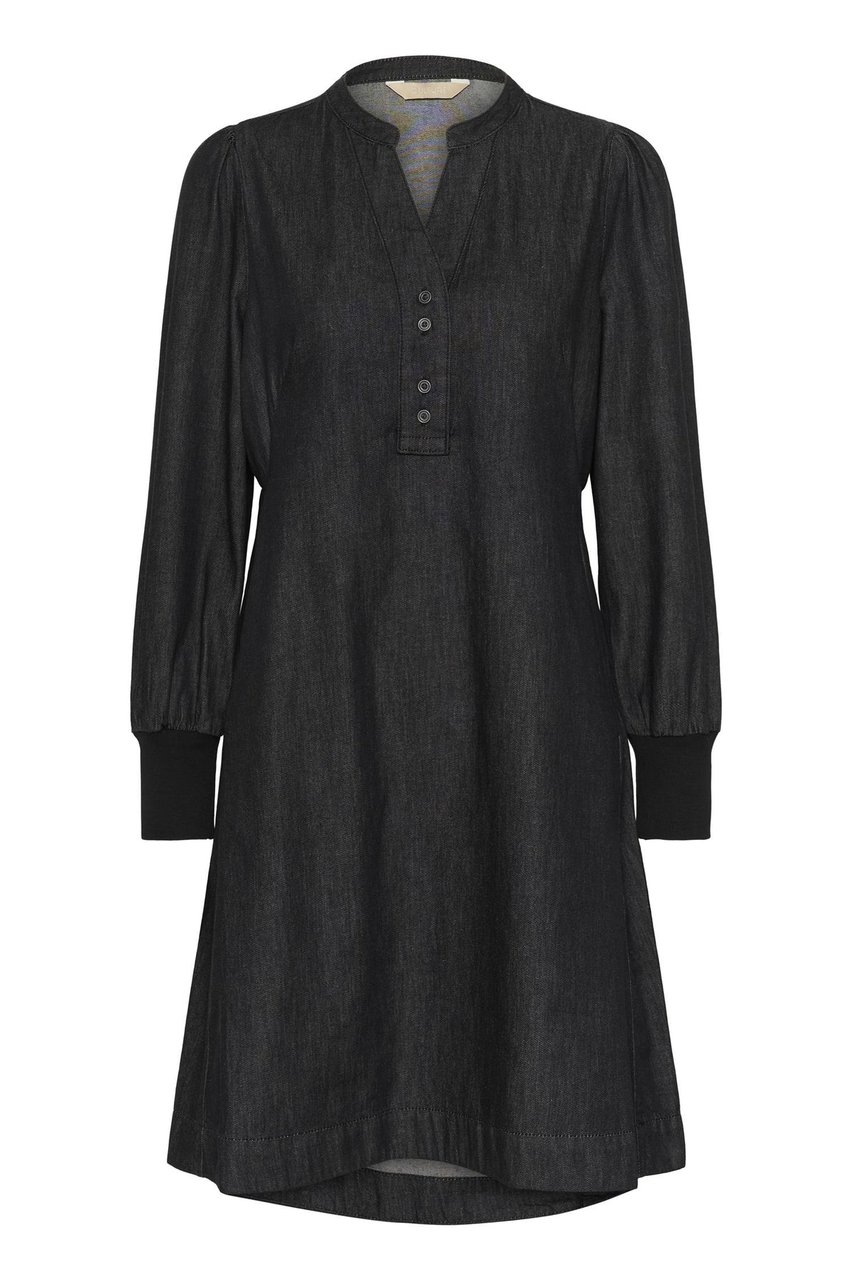 Kjolen har en flatterende A-fasong, lange ermer med strikkmansjett og en v-hals med knappestolpe som gir den et feminint, men avslappet uttrykk. Med sin klassiske sort melerte farge passer den like godt til sneakers og sandaler til hverdags, som til boots og strikkejakke på kjøligere dager.