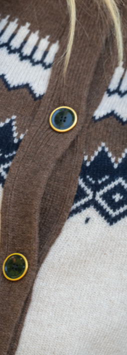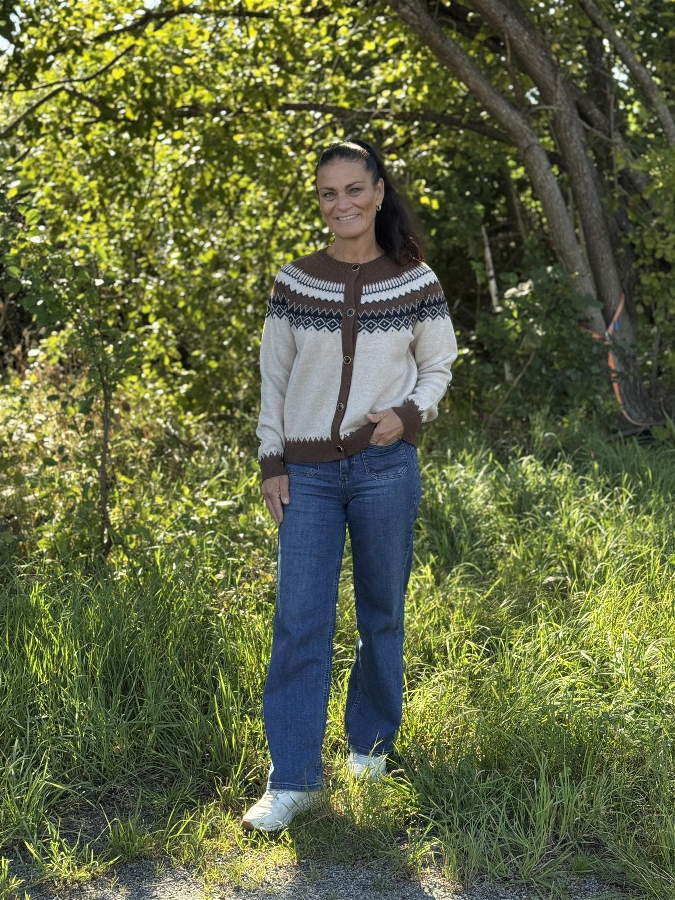 Dette er cardiganen du bare vil bo i! Myk, god og varm – akkurat sånn vi liker det. Den har et fint mønster i jordfarger, med fine detaljer som gjør det lille ekstra. Passer like fint til jeans og joggesko på en vanlig hverdag, som over en kjole eller bluse når du vil pynte deg litt mer.