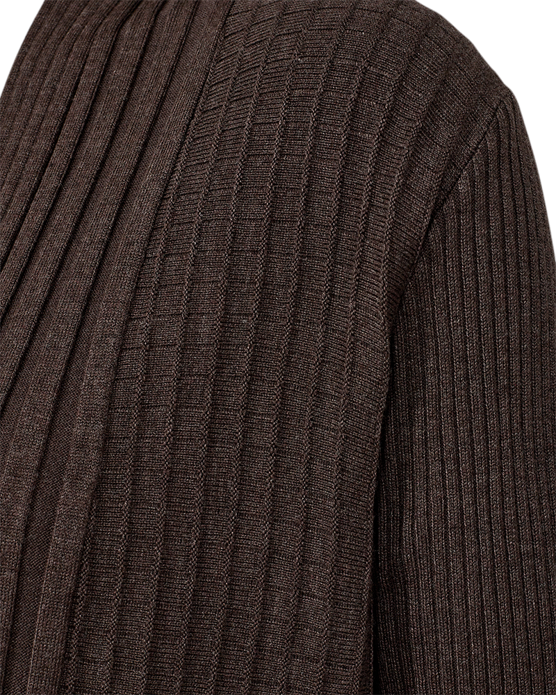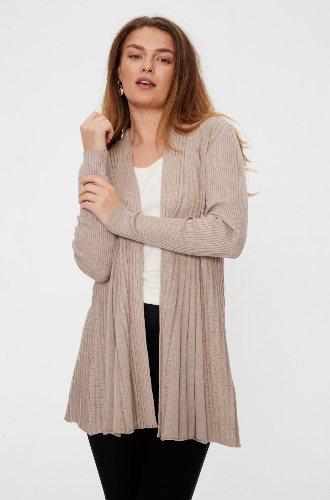Myk, halvlang cardigan fra Freequent i en elegant coffee brown farge. Den har en enkel, åpen fasong med lange ermer og ribbede detaljer. Både foran og bak finner du fine legg som gir plagget et flatterende fall og en feminin A-shape.