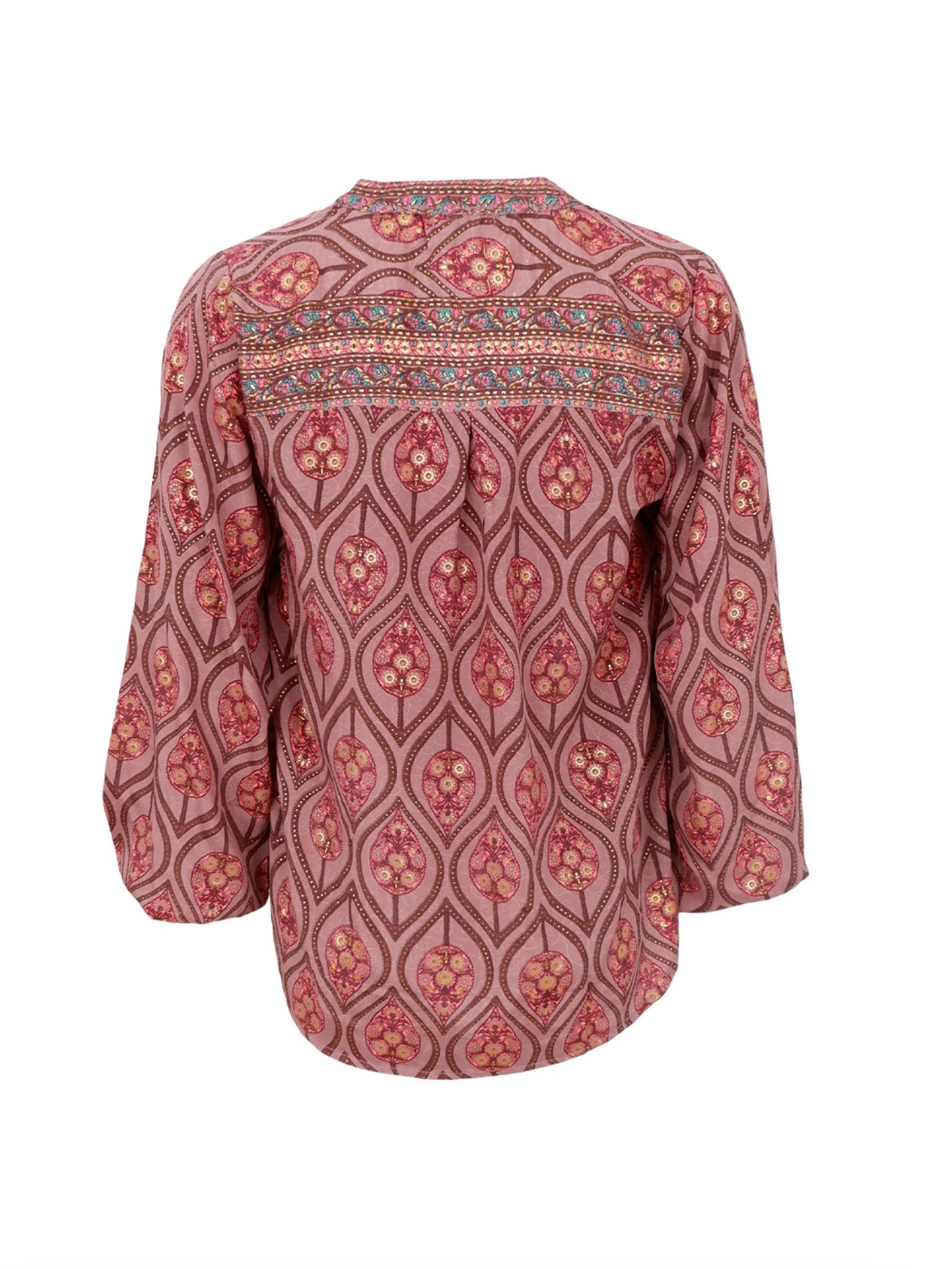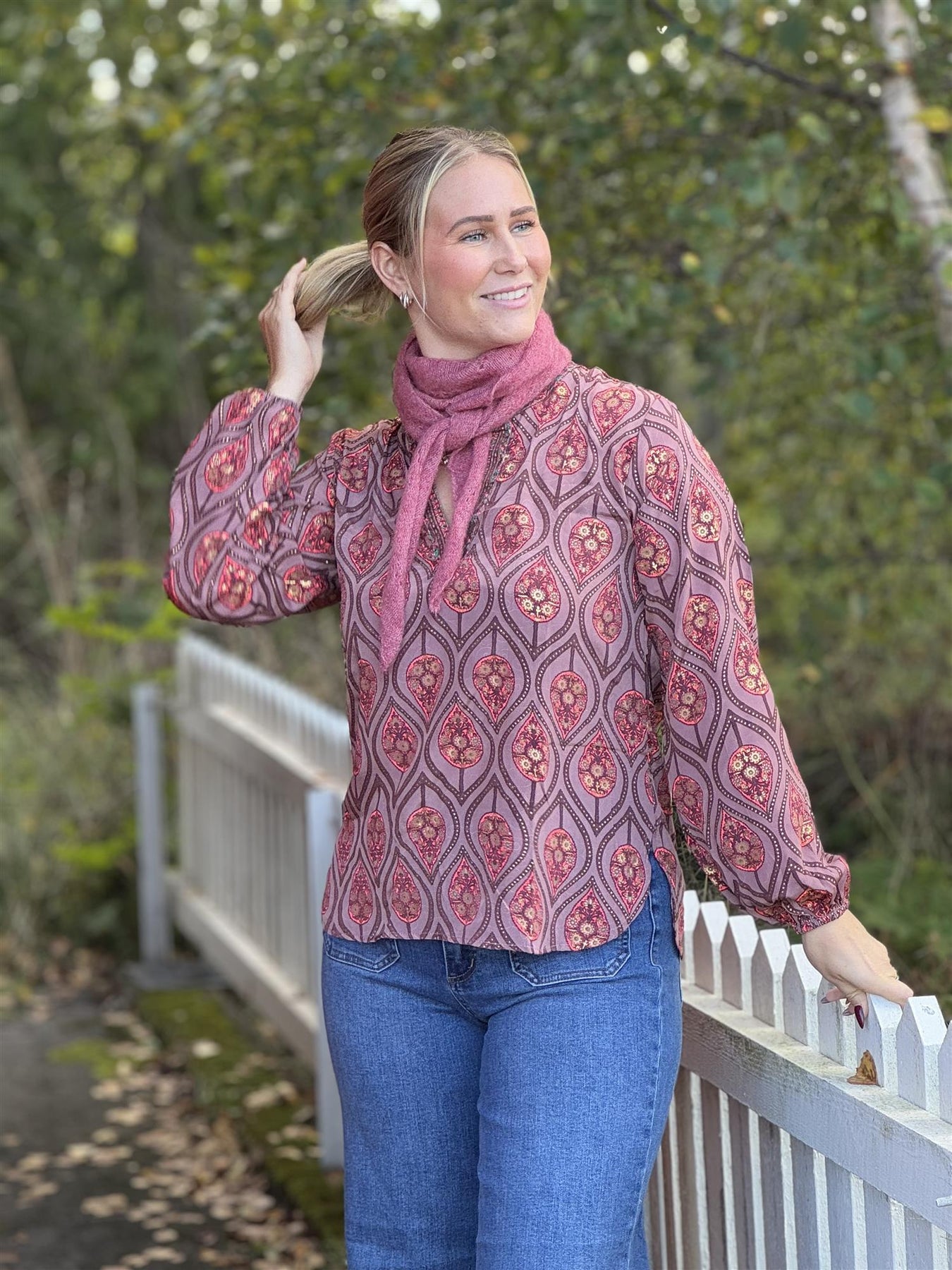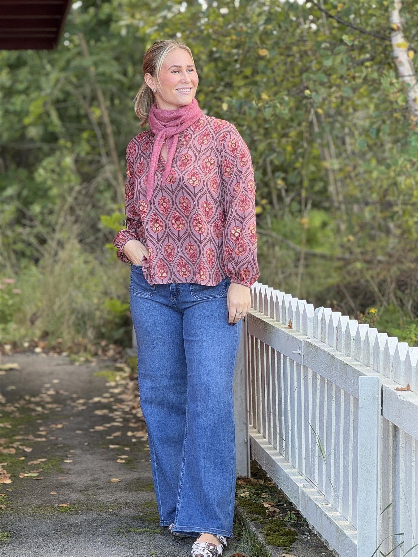 Blusen har en fin v-hals som gir et feminint uttrykk, og de lange ermene med elastikk gjør at den sitter pent uten å stramme. Det er printet som virkelig gjør Luna spesiell – friskt, lekent og helt unikt.