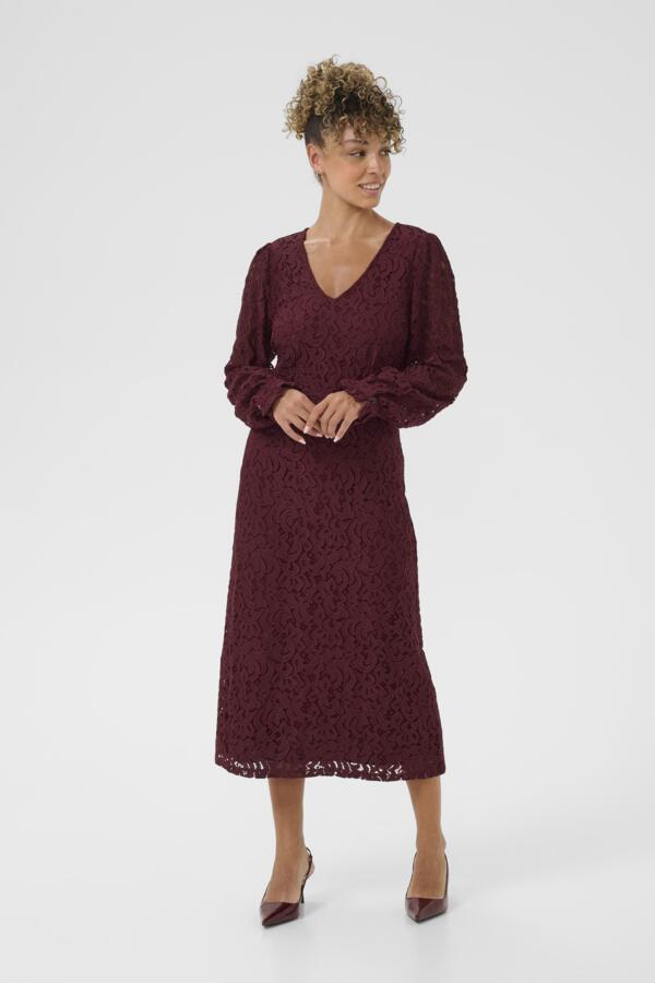 En nydelig kjole til alle de fine anledningene! Denne vinrøde blondekjolen fra Cream har et tidløst snitt med v-hals, lange ermer og midi-lengde som gjør den både elegant og behagelig å bruke.