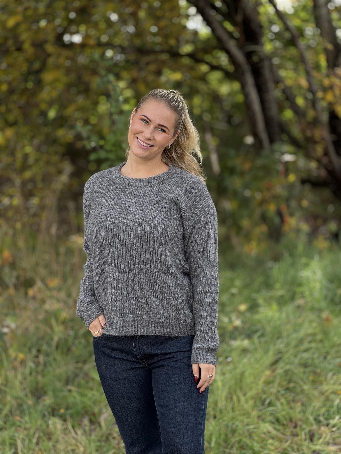 Grå strikket basisgenser i ullmix. Denne genseren er super hele året, på kjølige sommerkvelder - og på den kalde årstiden.