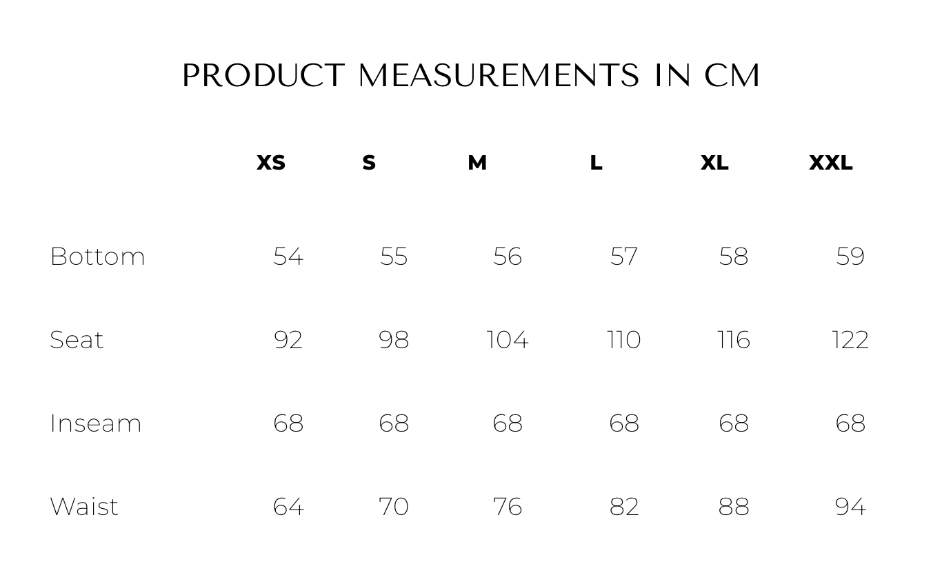 Innerben-lengde (inseam): ca 68 cm i alle størrelser (34–44), som gir en normal til litt kortere benlengde (rett og myk bukse – ikke superlang)