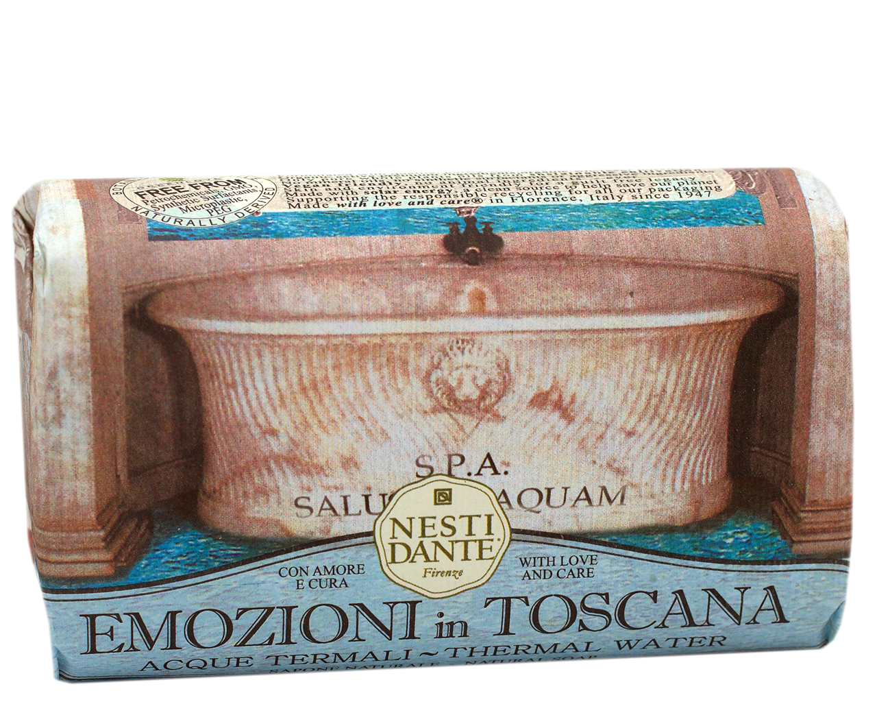 Emozioni in Toscana natursåpen kan vekke tanker om de gamle Romerske bad. Såpens rene duft, helt uten mineraloljer eller syntetiske stoffer, etterlater huden din myk og god. Velduftende, som om du hadde vært på spa.