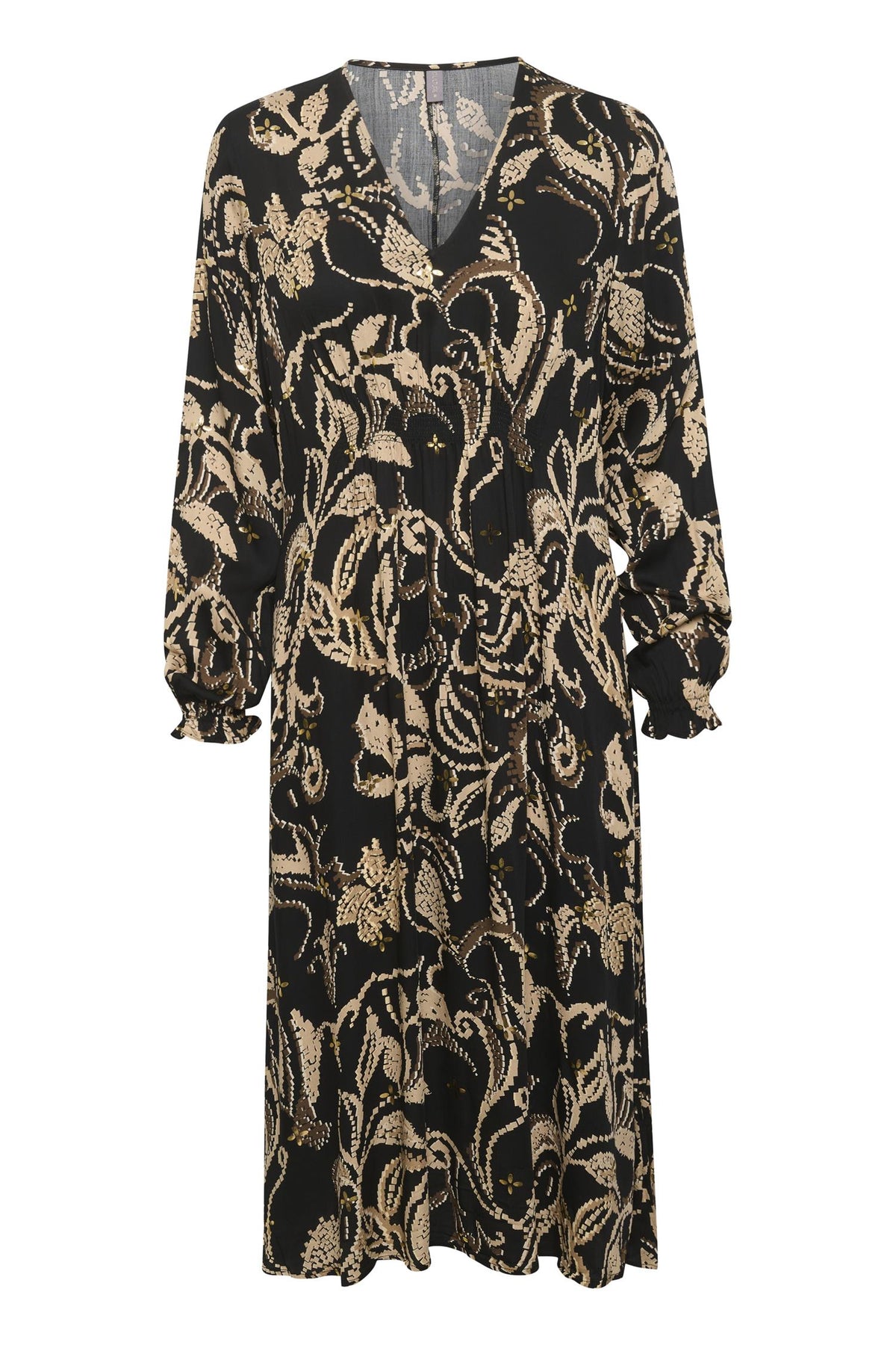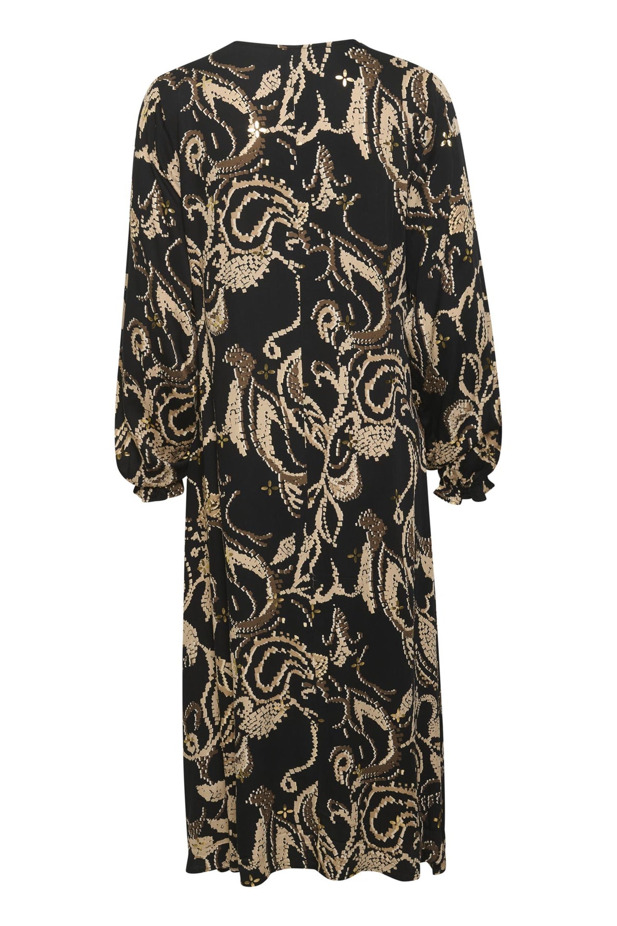 Lang kjole med et nydelig blomstermønster i gull. Denne kjolen har en delikat V-hals, lange ermer med elastiske mansjetter og en lang og smigrende lengde. Denne kjolen er perfekt for både spesielle anledninger og hverdagsbruk.